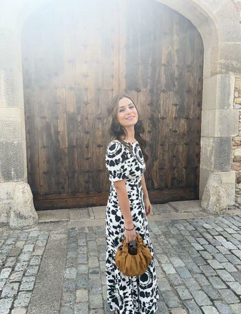 Bolso con asa de mano y detalle de nudo con cierre de imán. Fabricación artesanal.