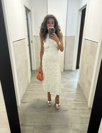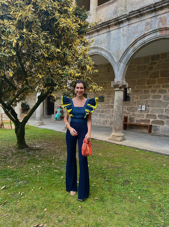 Bolso con asa de mano y detalle de nudo con cierre de imán. Fabricación artesanal.