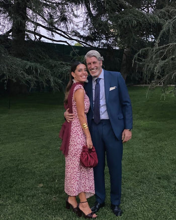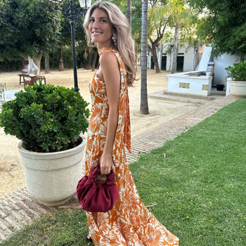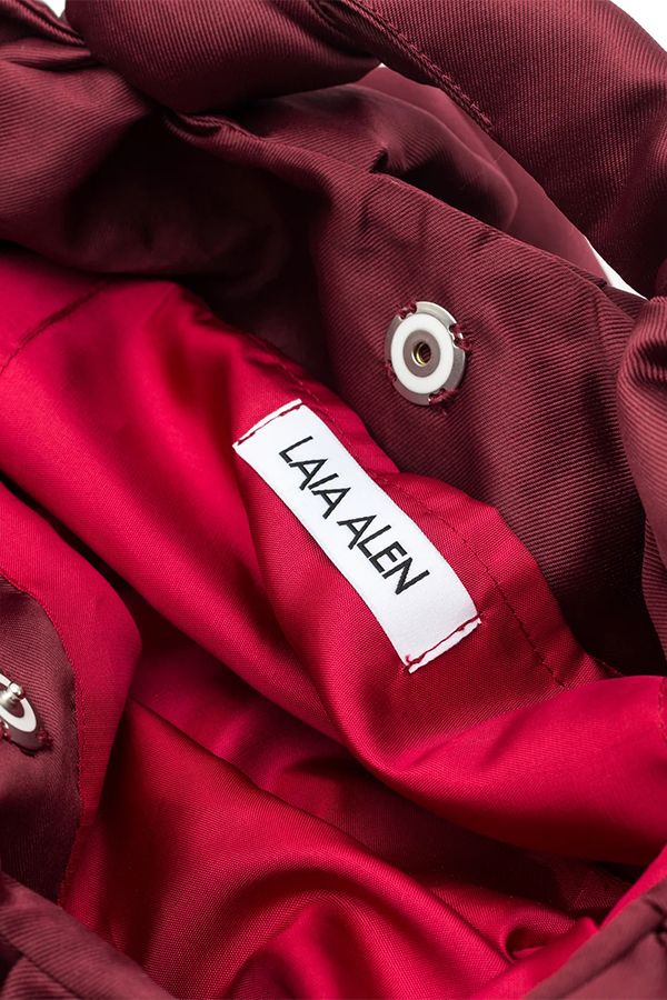 Bolso con asa de mano y detalle de nudo con cierre de imán. Fabricación artesanal.