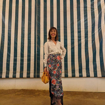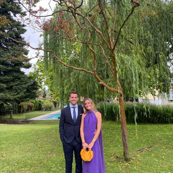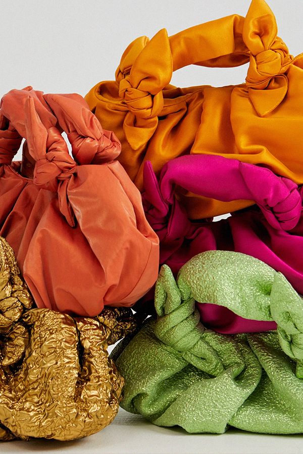 Bolso con asa de mano y detalle de nudo con cierre de imán. Fabricación artesanal.