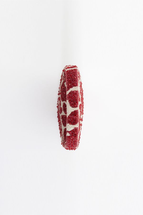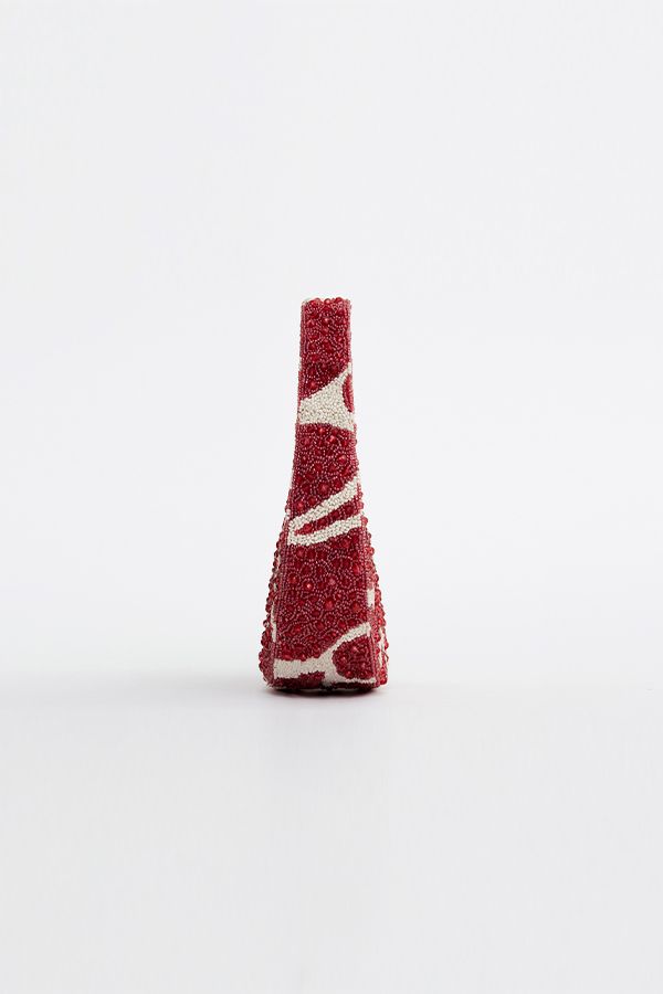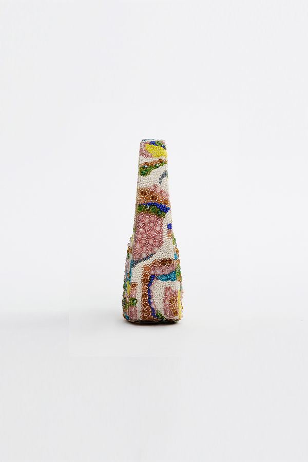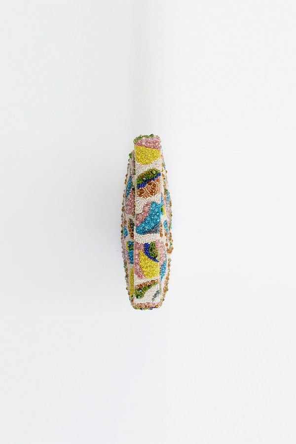 Bolso elaborado a mano con cuentas, con un exterior texturizado y un diseño artístico. Incluye cierre de cremallera y bolsillo interior.