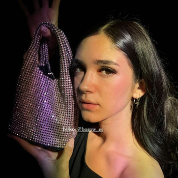 Bolso de tamaño medio adornado de cristales, asa de mano y un único compartimento con capacidad suficiente. Incluye cadena para colgar.
