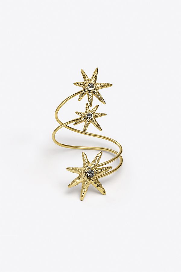 Pulsera envolvente ajustable que se adapta a cualquier tamaño y altura. Incluye tres estrellas de diferentes tamaños con cristales Black Diamond en tono gris. Se sugiere usarla con la estrella más grande en la parte superior.