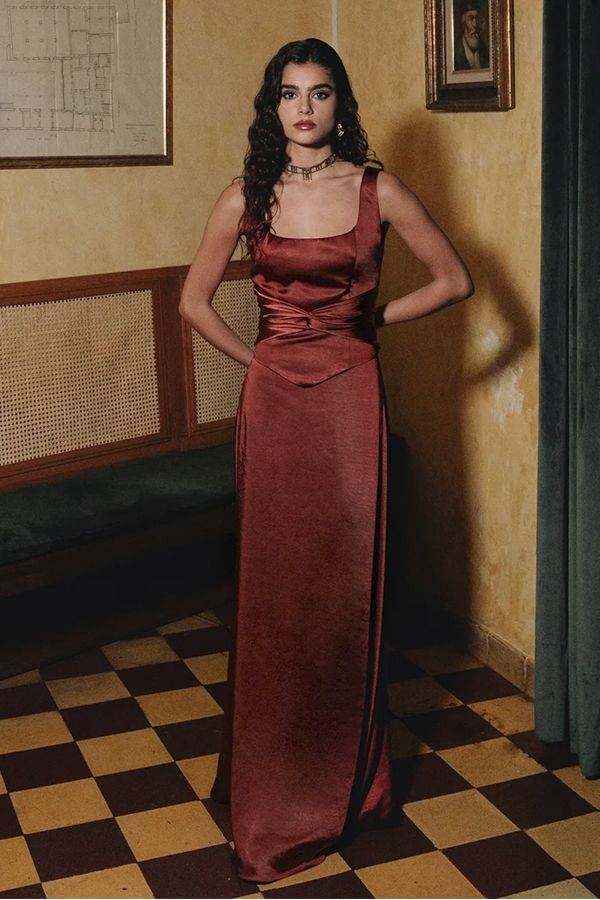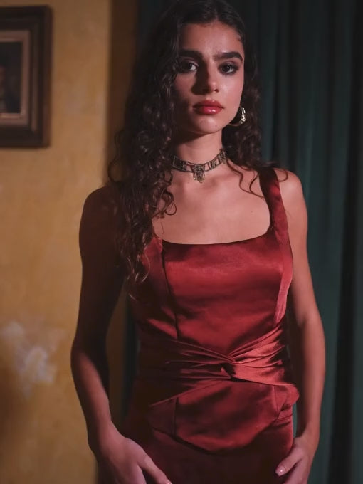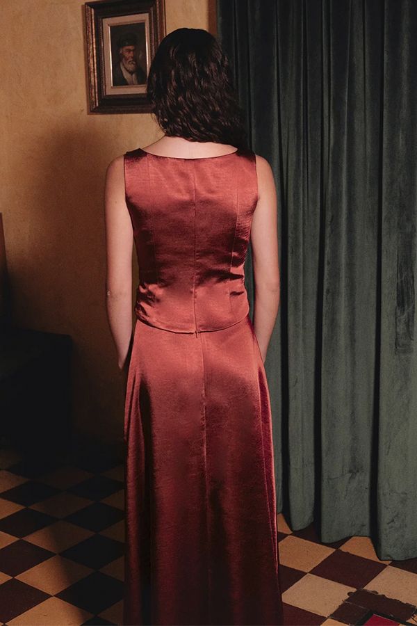 Conjunto de dos piezas compuesto por un top estilo corsé con escote cuadrado, tirante ancho, cierre trasero de cremallera, ajuste en la cintura y bajo en punta. Falda de tiro alto con cremallera trasera y bajo recto.