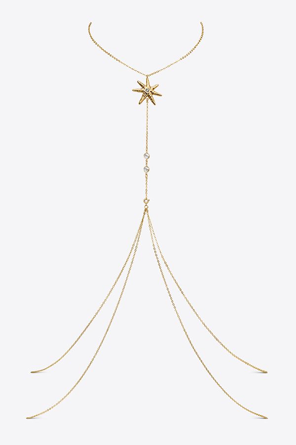 Cadena dorada fina para el cuerpo, decorada con una estrella colgante y cristales Black Diamond. Incorpora un mosquetón en la parte delantera y trasera, lo que permite convertirla en un collar estilo gargantilla al retirar las cadenas.