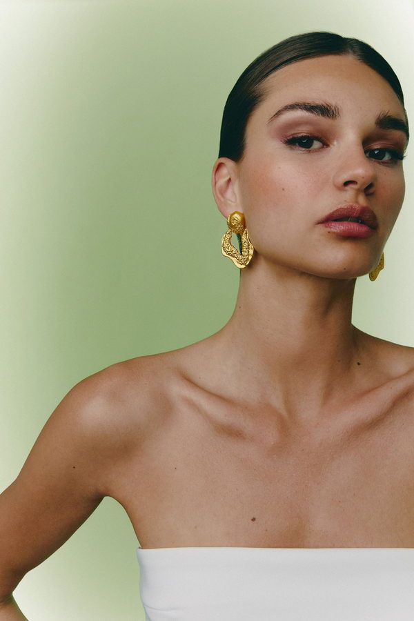 Pendientes tipo aro irregular suspendidos de un botón abombado; interior granulado y zonas pulidas.