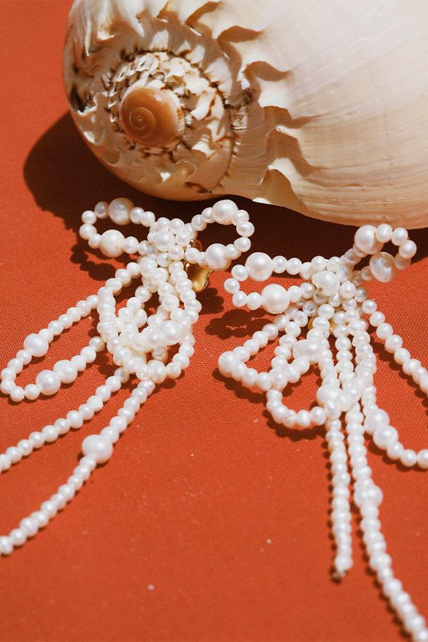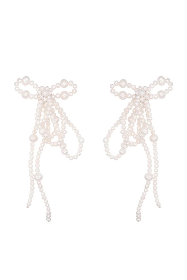 Diseño de perlas pasadas una a una a mano por hilo de nylon formando unos románticos lazos con una larga caída. Debido a su carácter natural puede variar en forma y tamaño.