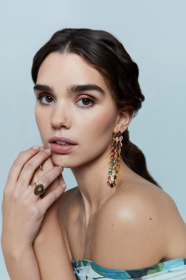 Los Pendientes Prana Multicolor reflejan la esencia de la fuerza vital que fluye a través de cada ser. Inspirados en la energía vibrante de los chakras, combinan piedras semipreciosas de colores que representan el equilibrio y la armonía interior.