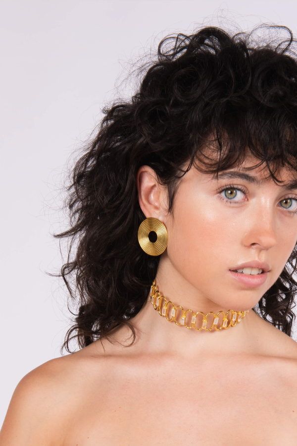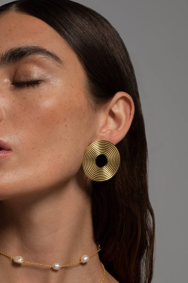 Pendientes redondos planos grandes y dorados con baño de oro. Diseño frontal de tamaño medio, perfecto para cualquier ocasión.
