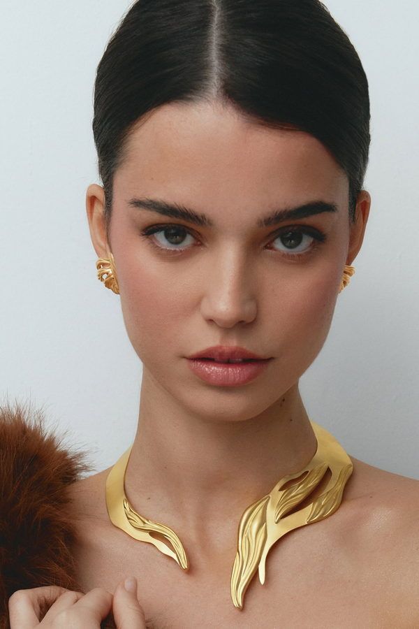 Pendiente tipo ear cuff que abraza el lóbulo con tiras de efecto drapeado; cierre con poste y tuerca.
