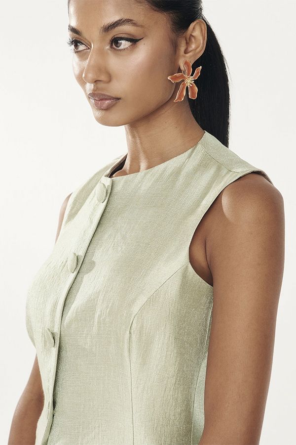 Top sin mangas y cierre frontal con botones forrados a tono. Pantalón recto de talle alto con aberturas laterales y cierre frontal con cremallera.