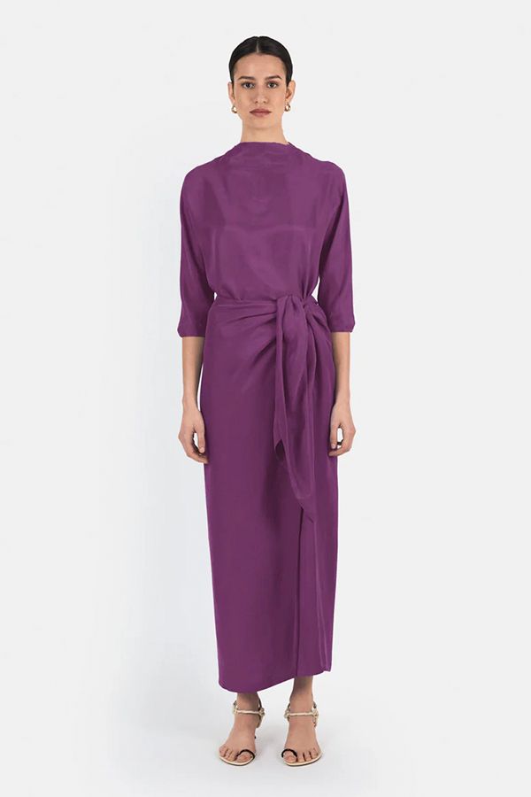Conjunto de dos piezas. Parte superior de cuello cerrado, manga francesa y detalle de nudo lateral. Falda recta con abertura en el dobladillo.