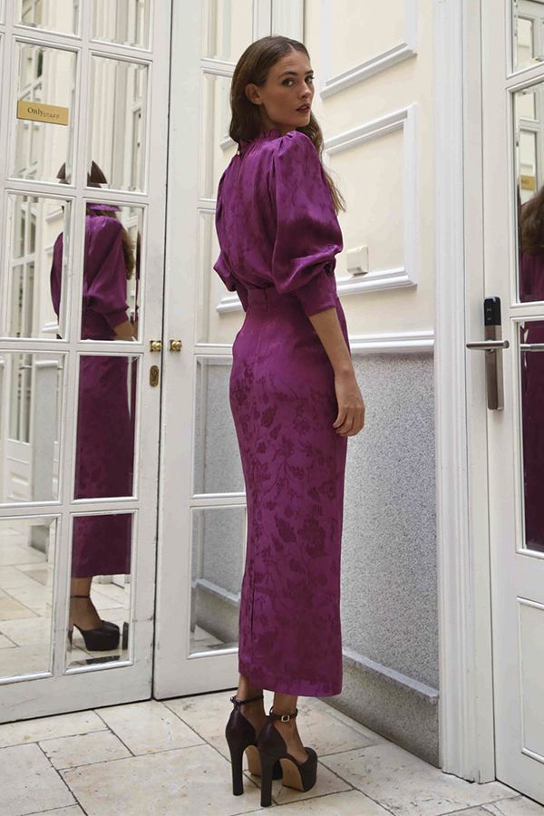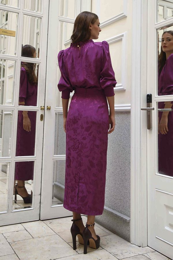 El conjunto está compuesto por una falda tubo de largo midi con cinturilla de tiro alto, acompañada de una blusa de cuello subido y mangas largas abullonadas.