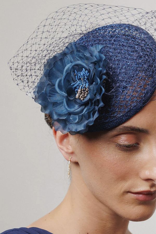 Tocado de sinamay con flor y velo. Se sujeta con diadema. Hecho a mano en España.