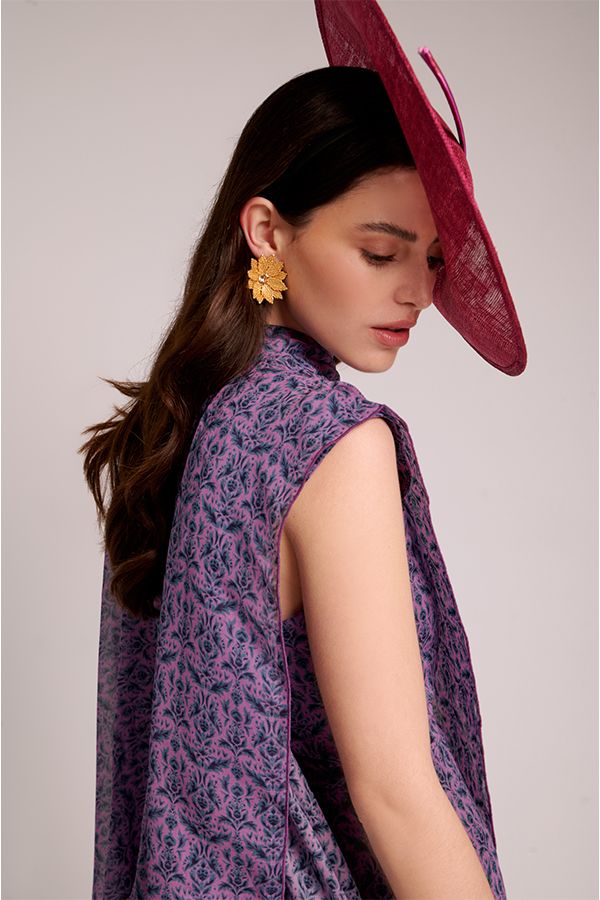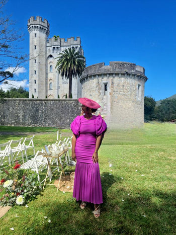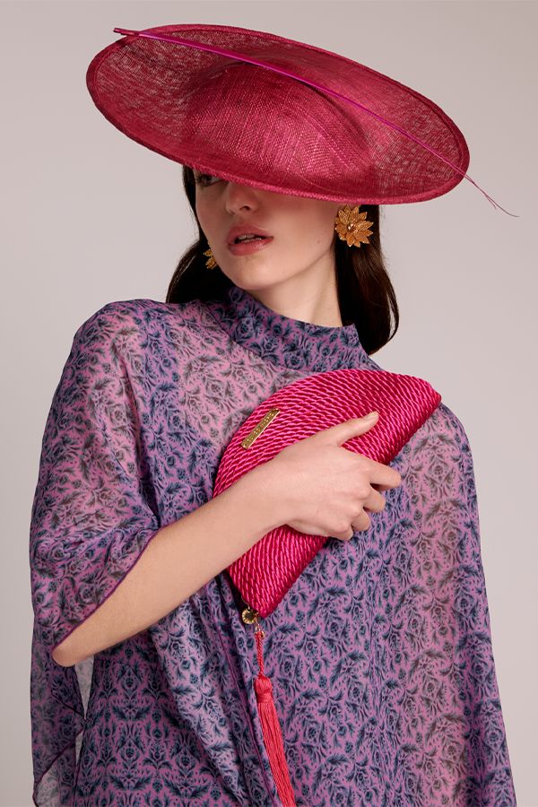 Tocado en tono buganvilla, adornado con raquis a juego, se sujeta con una diadema. Hecho a mano en España.