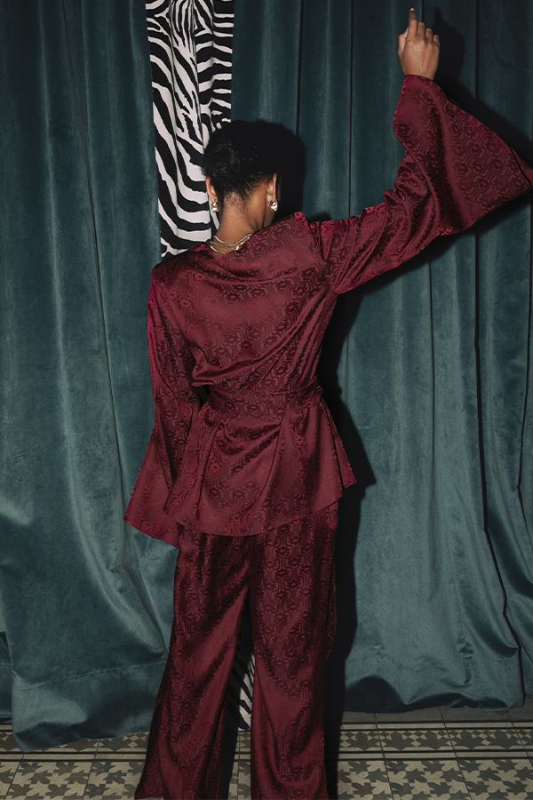 Conjunto de dos piezas. Blazer con estampado floral, fajín desmontable y manga larga acampanada. Pantalón recto y amplio, tiro alto y apertura profunda en el dobladillo.