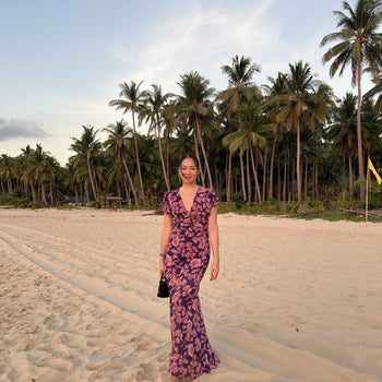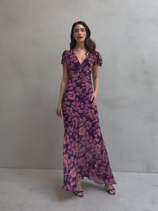 Vestido largo con manga corta de doble volante, escote en V y fruncidos en la cintura. Espalda cerrada con lazada ajustable.