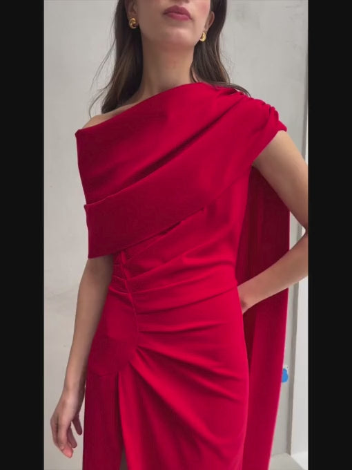 Vestido midi asimétrico con panel y frunces. En la parte posterior, capa caída como detalle.