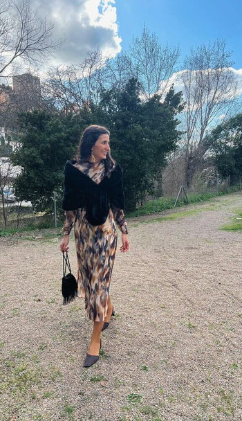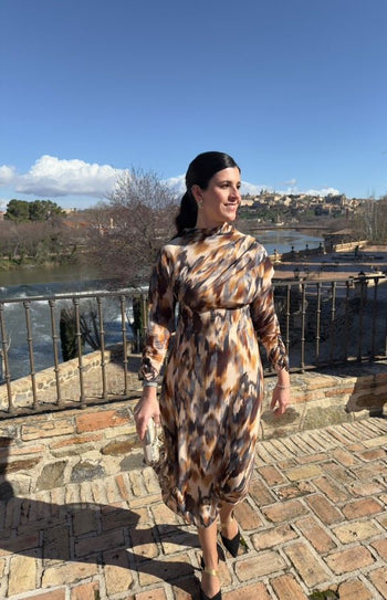 Vestido con estampado en tonos marrones, beige y azul. Diseño de manga larga con frunce en los puños y drapeado en el hombro izquierdo. Tejido con caída, falda en línea evasé y cintura entallada sin cortes de costuras.