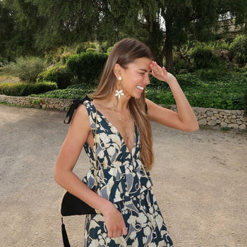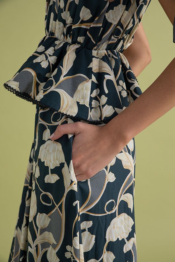 Prenda de algodón con dobladillo de volantes, llamativos lazos que adornan los hombros y cierre de cremallera oculta en la espalda.