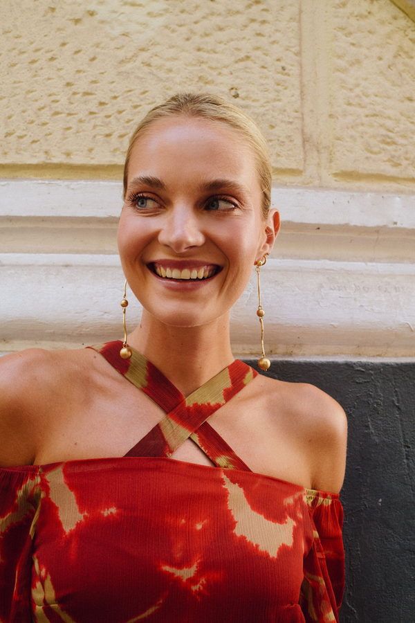 Vestido confeccionado en gasa estampada en tonos verde empolvado y pimentón. Tiene escote Bardot y no lleva corte en cintura. El diseño es recto hasta el bajo, con longitud midi y lleva dos tirantes cruzados en el escote, que acaban en la espalda. Se cierra con cremallera invisible. El vestido lleva forro de punto transpirable a tono.