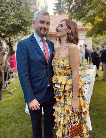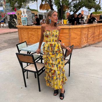 Vestido con estampado botánico presenta tirantes cruzados en la espalda y un corpiño recortado que se despliega en una silueta midi con volantes. Se cierra con cremallera oculta en el centro de la espalda.