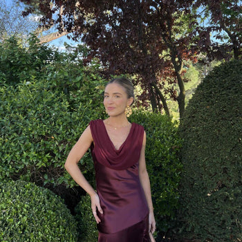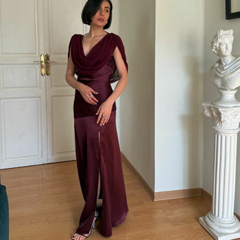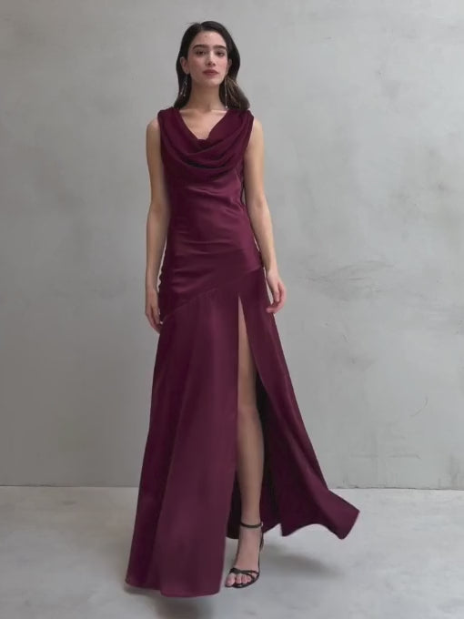 Vestido largo sin mangas con escote holgado y capa de gasa a tono que se extiende hasta la espalda abierta.
