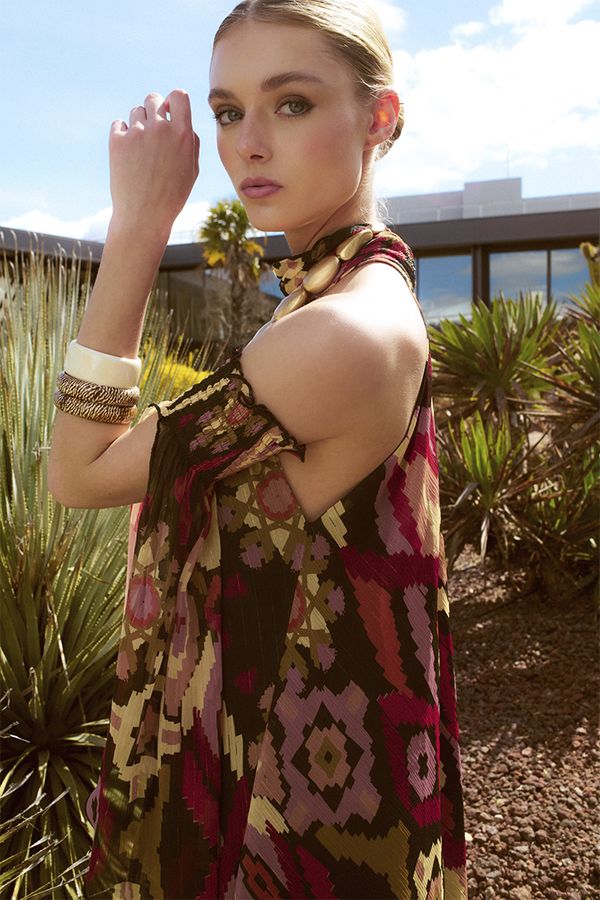 Vestido midi-largo de gasa estampada con hilo metalizado. Cuello halter y diseño suelto sin corte en la cintura. Cortado al bies para mayor movimiento. Incluye manguitos opcionales. Cierre en el cuello con botones y forro al tono.