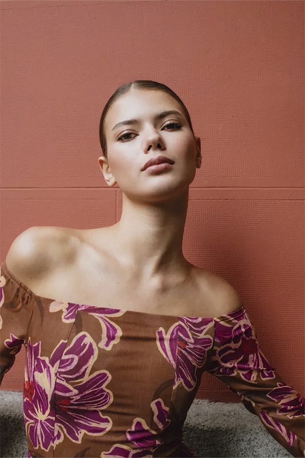 Vestido de gasa estampada en tonos chocolate y maquillaje, con escote bardot y mangas acampanadas. La falda es recta, con un corte por encima de las rodillas, y un volante fruncido que añade vuelo y movimiento. Forrado en tejido de punto transpirable.