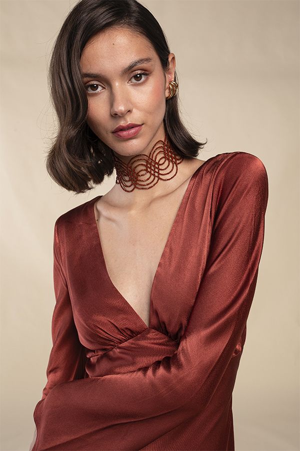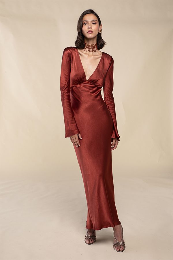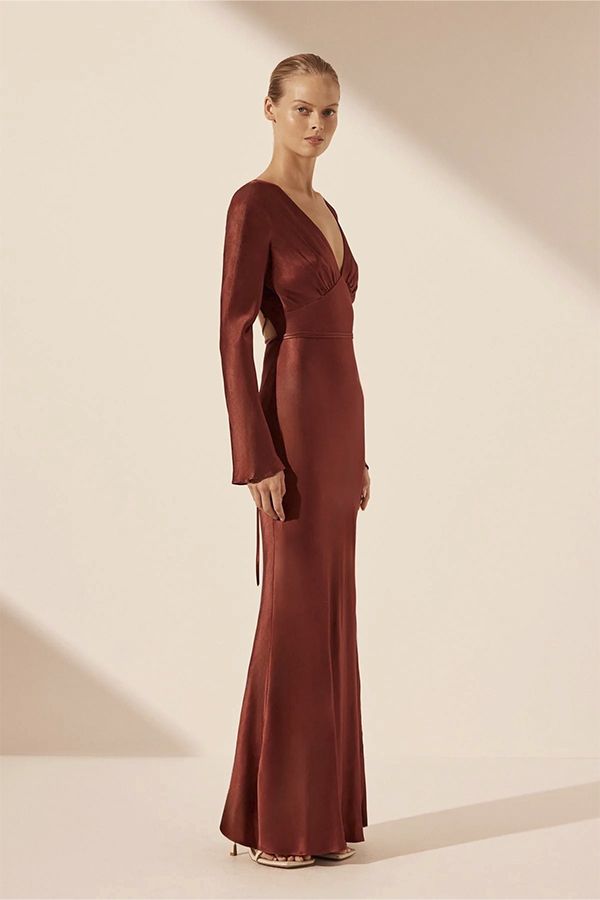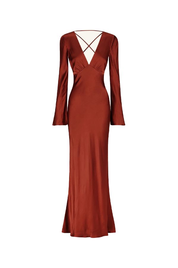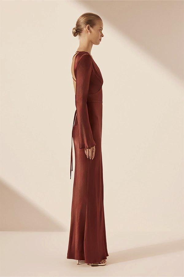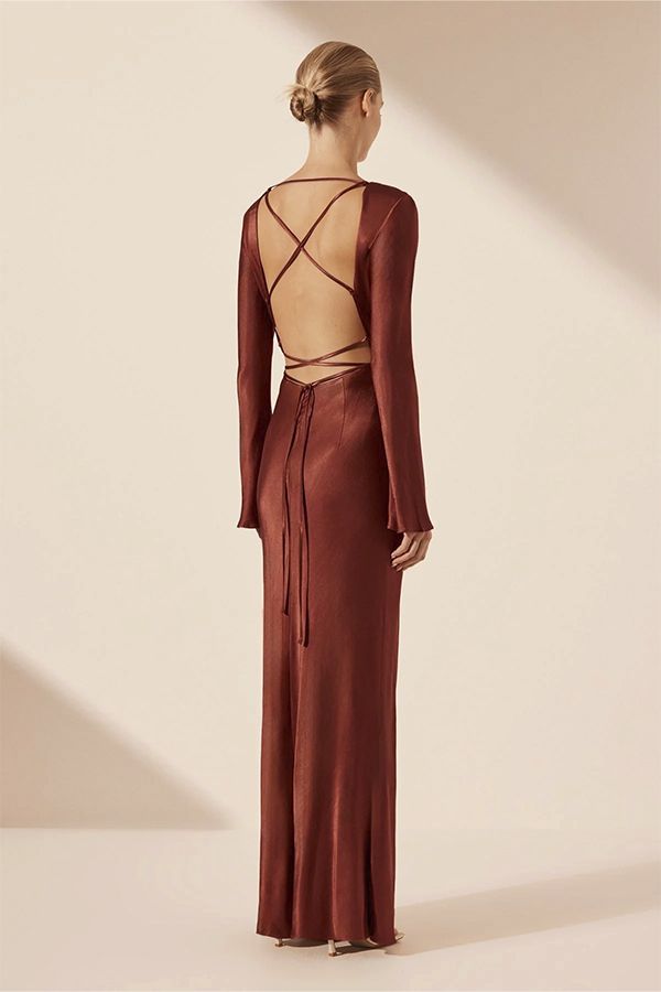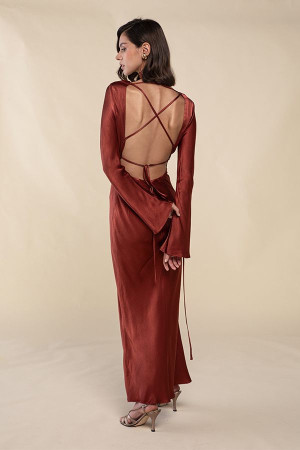Vestido largo confeccionado en tejido con tacto de seda y acabado brillante. Escote barco y mangas acampanadas cortadas al bies. La espalda abierta destaca con un detalle de lazo, y cuenta con una cremallera trasera invisible para cierre. La falda, también cortada al bies, fluye suavemente, confeccionada en un tejido de peso medio y no elástico.