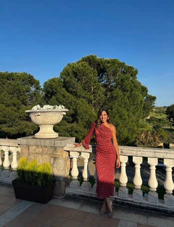 Vestido de corte midi confeccionado en gasa estampada con hilo metalizado en tonos rosa y granate. Presenta un escote drapeado asimétrico con un hombro al descubierto y una pieza multiposición cruzada de lado a lado. El lateral fruncido añade movimiento y realza la silueta. Se cierra con cremallera invisible en la espalda y va forrado en punto a tono.