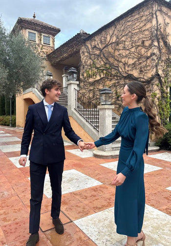 Vestido midi de georgette en color azul petróleo con hombreras en pico, mangas raglán abullonadas y puños con botones forrados a tono. Aberturas laterales. Incluye forro interior del mismo tejido que el vestido. Diseño fruncido en el cuello con lazada trasera ajustable.