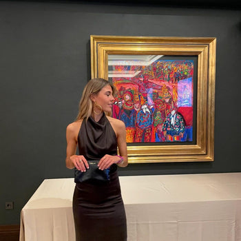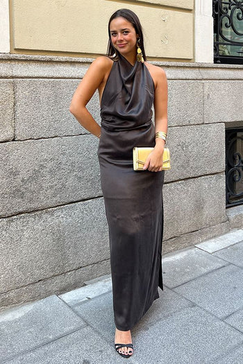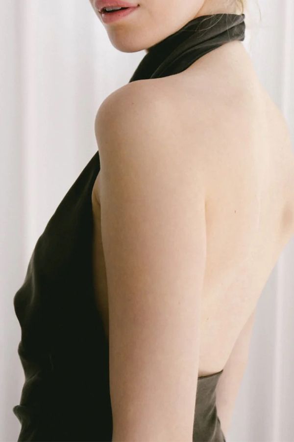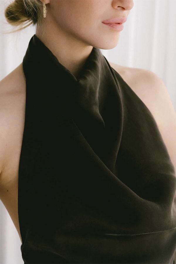 Vestido escote caído con espalda descubierta. Se ata en el cuello mediante dos botones interiores. Forrado.
