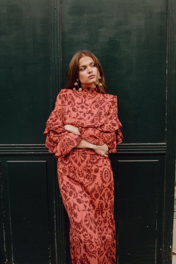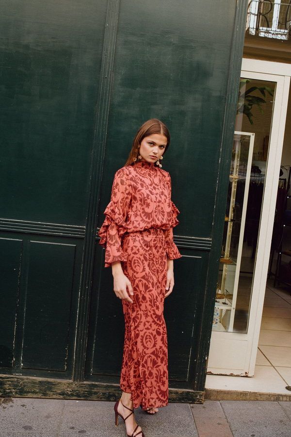 Total look confeccionado en gasa estampada en tonos rosas y berenjena, formado por: