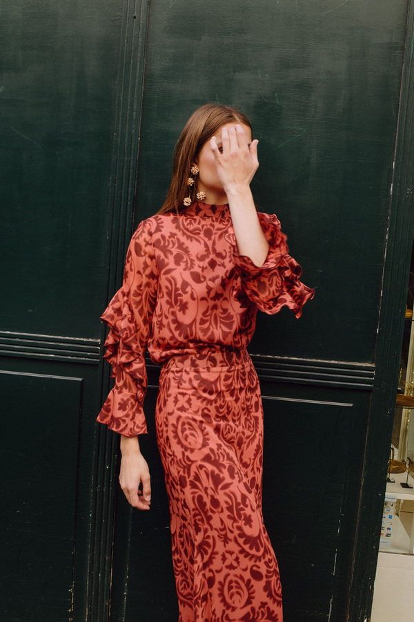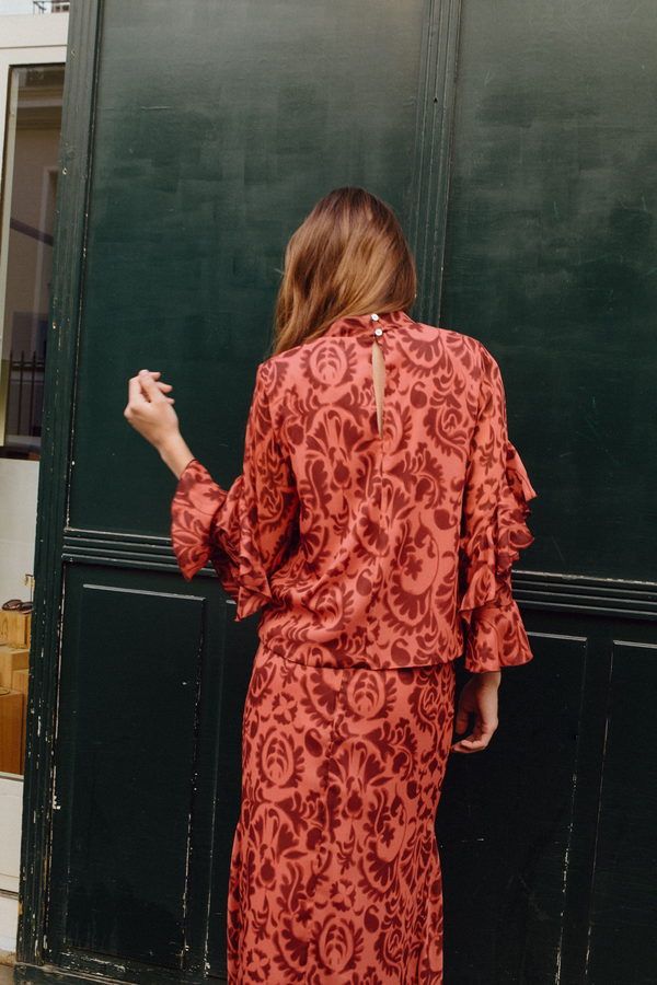 Top: tiene cuello perkins y mangas con volantes, lo que le proporciona mucho movimiento. Lleva hombreras y se cierra con dos botones en la espalda. Falda: recta con godets, lo que le aporta vuelo y movimiento. Se cierra con cremallera invisible en la espalda.