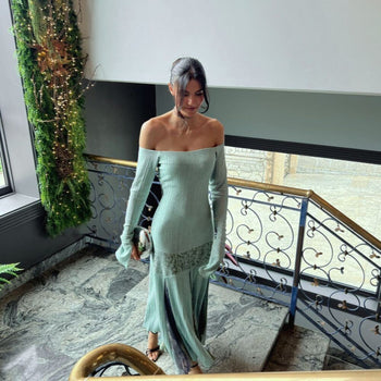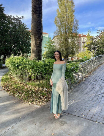 Vestido de largo tobillero y manga larga estrecha con abertura en el puño. Escote bardot y aplique superpuesto animal-print rematado con godets plisados en tonos verdosos y azulados degradados. Dobladillo con repulgo verde.