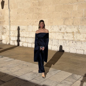 Largura maxi, cortado al bies y manga completa con abertura. Tejido satinado. El escote admite distintas posiciones.