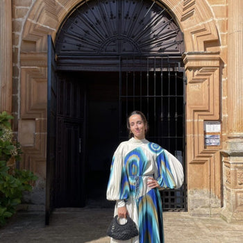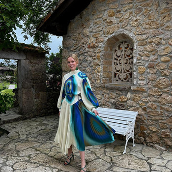 Silueta relajada con cuello alto que se extiende hasta la parte posterior del cuello y mangas globo con puño ajustado y abotonado. Canesú delantero y posterior para estructurar el corpiño, detalle de costura curva en la cintura y falda plisada con dobladillo asimétrico. Incluye cinturón de cuerda trenzada para mejorar el ajuste.